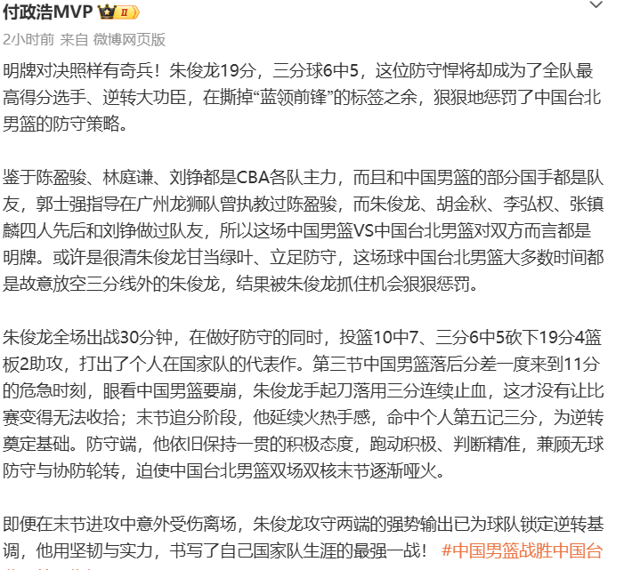 此役,担任中国队首发小前锋的朱俊龙表现堪称卓越,上场奋战30分钟,投篮10中7球,三分球6投5中,砍下全队最高的19分、4个篮板以及2次助攻,在中国队落后阶段多次命中底角三分帮助球队渡过难关,如同定海神针,帮助球队最终逆转台北,赛后朱俊龙也获得了球迷的高度好评,不少球迷和媒体人都将他评为中国队本场比赛的MVP。