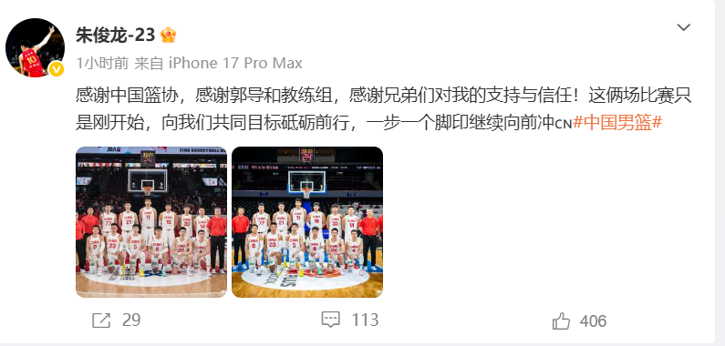 赛后,朱俊龙还在社媒发文,表示:感谢中国篮协,感谢郭导和教练组,感谢兄弟们对我的支持与信任!这两场比赛只是刚开始,向我们共同目标砥砺前行,一步一个脚印继续向前冲。